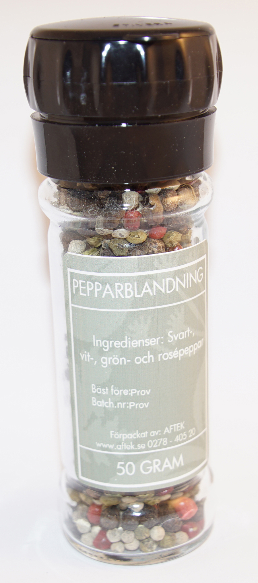 50g pepparblandning (svart- vit- grön- och rosépeppar) i glasburk med kvarn i locket och ett förslutningslock.