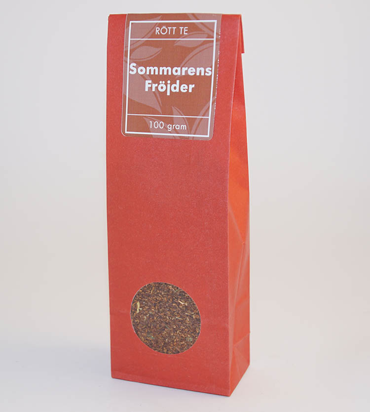 Ingredienser: Rött Rooibos-te, solros, hallonbitar och jordgubbsblad, arom