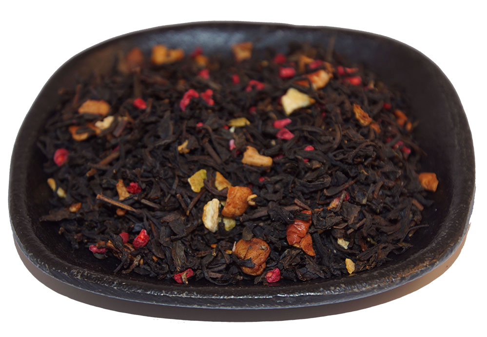 Ingredienser: Svart Kina-te, hallonbitar, äppelbitar, citronskal och arom